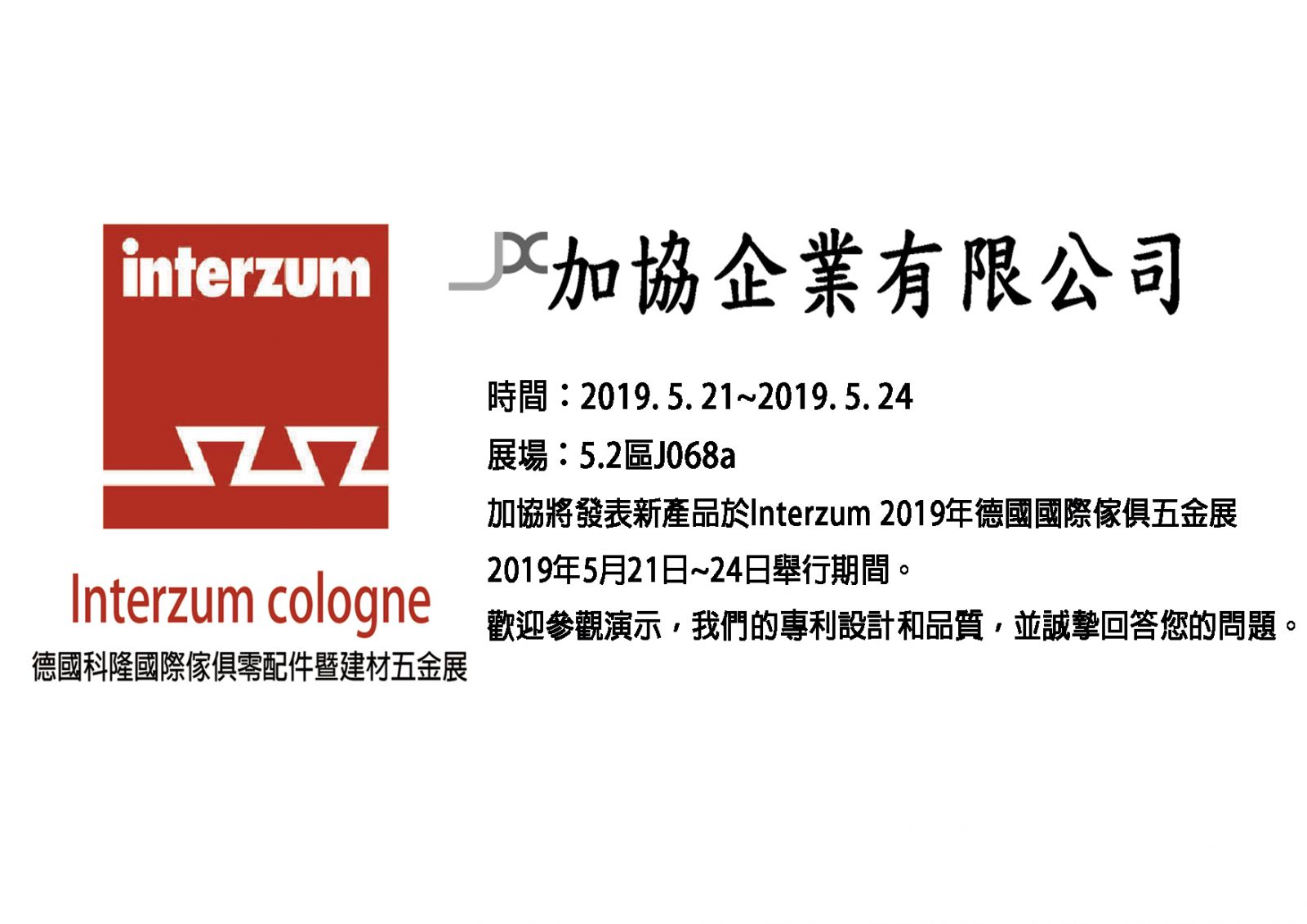 Interzum cologen德國科隆國際傢俱五金展,展覽時間從2019年5月21日到24日,加協展覽區位置在5.2區J068a。